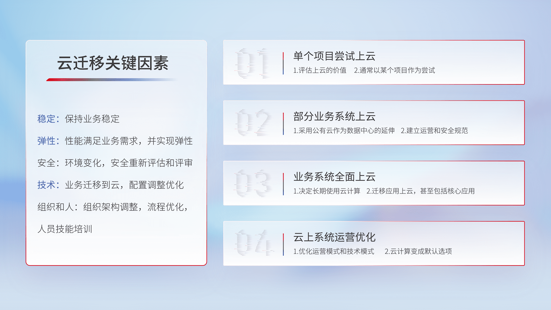 结合实际业务,,从规划设计、、、云平台选型、、云原生改造、、、、数据迁移、、、集成交付,,,迁移全过程为客户识别最佳上云路径,,做好风险识别管理,,设计网络架构、、、身份权限、、、安全审计合规、、、、操作审计、、、、日志审计、、监控告警策略、、、多站点容灾设计等,,,对云上基础设施进行整体规划,,,提升IT治理水平,,,,以满足弹性、、、高可用、、、高性能的需求。。